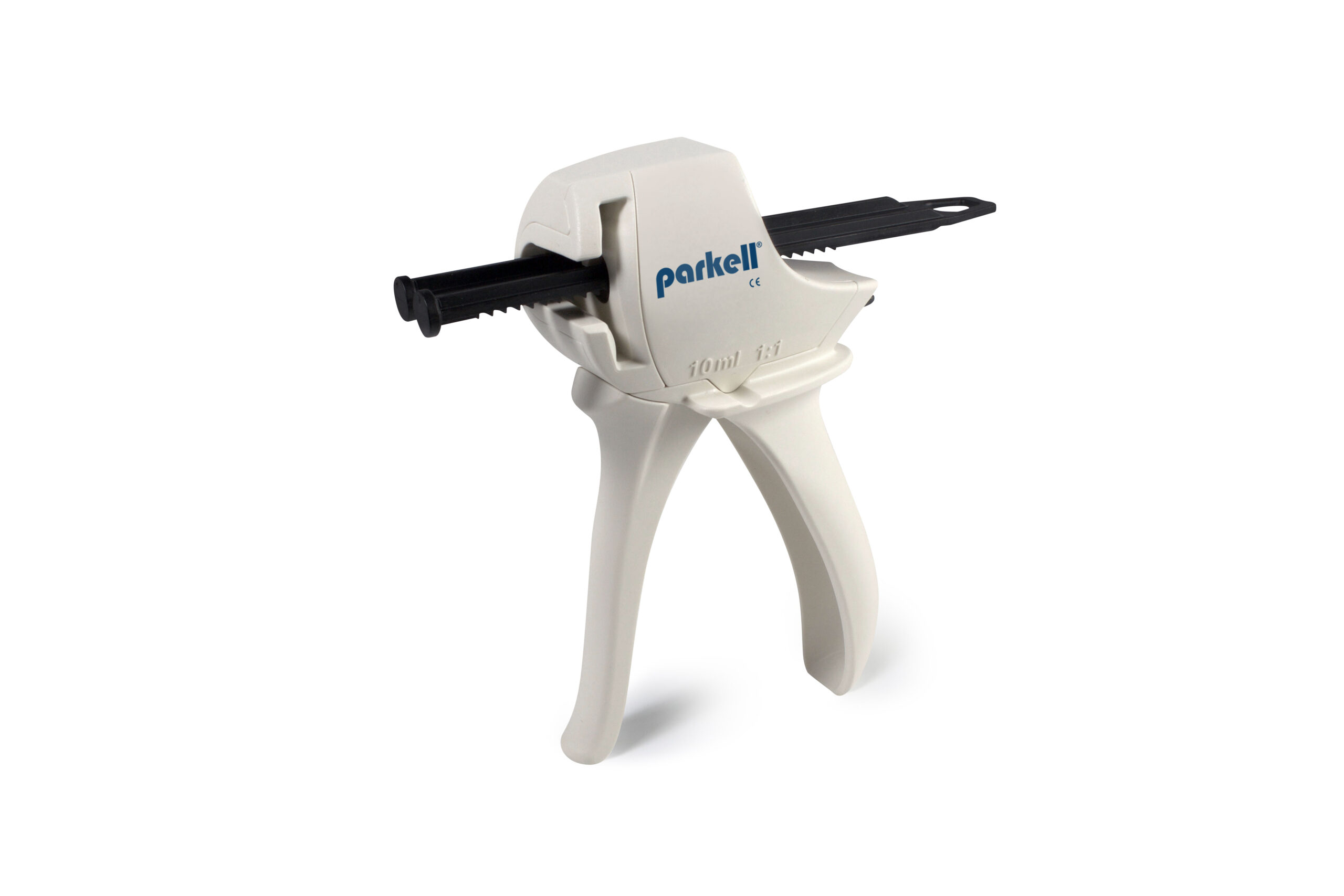 Manual dispensing gun designed for chairside extrusion of dental materials supplied in 10ml split cartridges with 1:1 volumetric ratio. The device features a coordinated release lever and plunger mechanism for cartridge loading and removal. Ergonomic trigger design facilitates controlled material dispensing during clinical procedures.